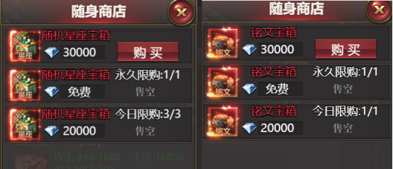 2. 星座铭文购买获取:目前建议是点击宝物-星座-获取购买每日星座宝箱,价格有一定折扣,相对更划算