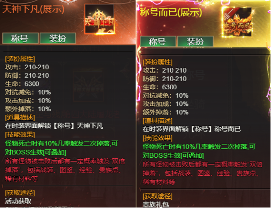 后面其他称号也可以考虑,像v6v7称号【天神下凡】【称号而已】可以增加二次掉落,也能叠加(二次掉落为触发后再次获取一次额外掉落,但不是直接复制原先掉落道具,因此两次掉落可能获取的道具是不同的)