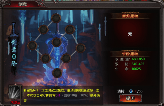 击败虚空剑界BOSS之后可获得剑意精石,用于提升剑意,激活剑意可获得超强技能断空斩:攻击时必定触发,催动剑意施展致命一击,本次攻击对守护附带额外伤害。