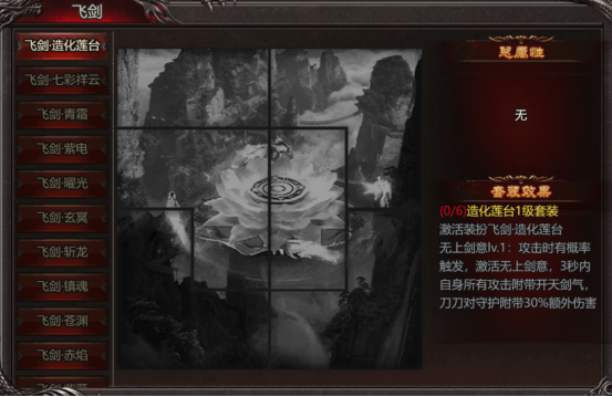 飞剑·造化莲台:集齐6套激活无上剑意:攻击时有概率触发,激活无上剑意,3秒内自身所有攻击附带开天记起你,刀刀对守护附带额外伤害