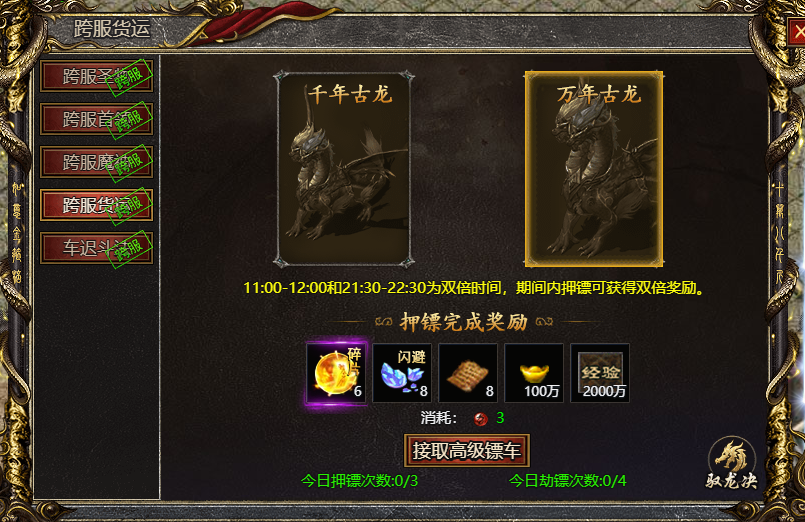 进入到跨服战场地图后,可以找到NPC“山庄镖头”对话,领取镖车押送到目的地即可。镖车共有千年古龙和万年古龙,前者免费接取,但是奖励略低;后者需花费3个【跨服镖令】领取,而且奖励更丰厚。