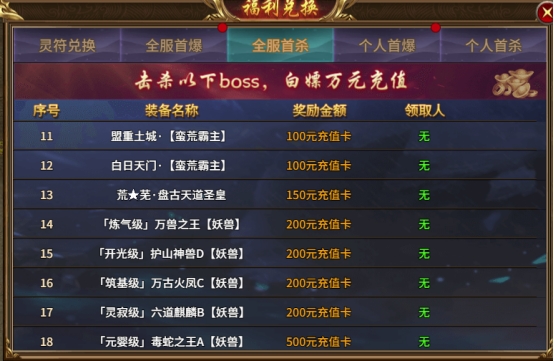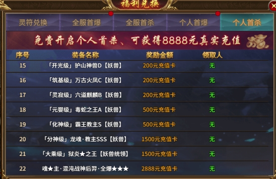 《个人首杀》实打实属于个人,只要杀了必获得。整体可获得8888元充值卡。对你称王称霸的道路上起到很大的助力。