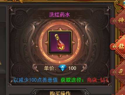 3. 每瓶洗红药水可清除100点善恶值,洗红药水可以用钻石进行购买。