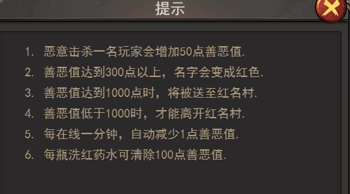 2. 善恶值达到1000点以时,价格被送至红名村,善恶值低于1000时,才能离开红名村,每在线一分钟,自动减少1点善恶值。