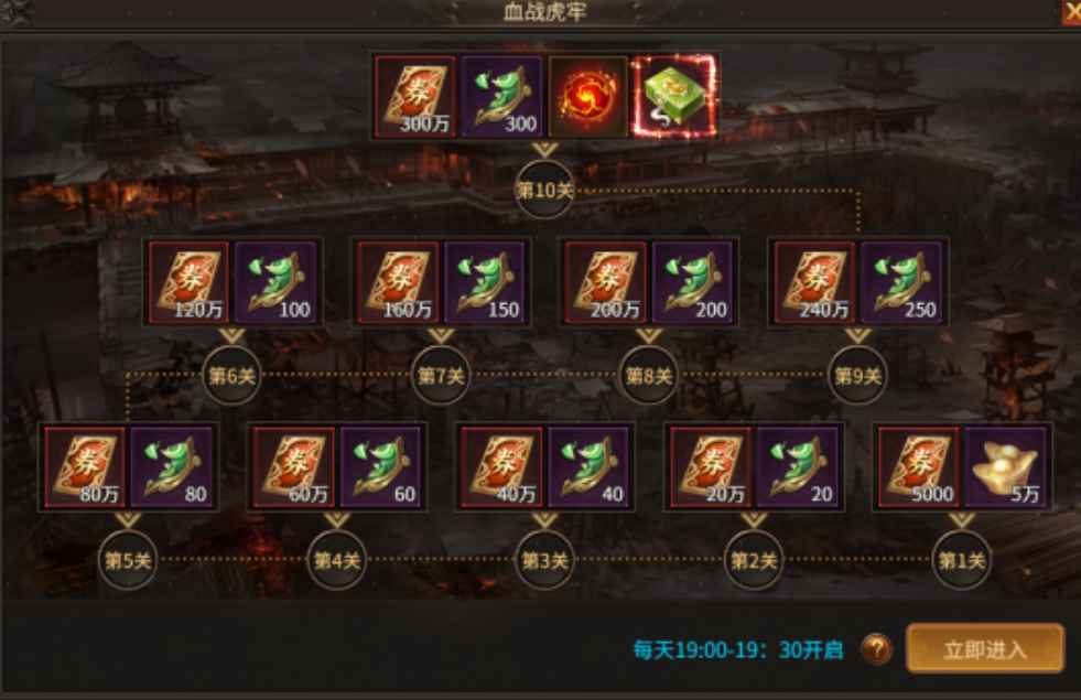 1. 虎牢共10关,活动开启后所有玩家进入第1关。