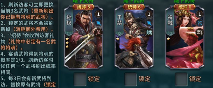 招待:消耗元宝在里面获得武将碎片。可以通过刷新访客(可以刷新出已拥有的武将或者武将碎片),来更换当前界面的三名武将,锁定的武将将不会被刷走。比如您想要刘表,法正,高顺的武将,那么您在拥有这3个武将的碎片或者本体武将的时候,就有机会刷新出来。一般在当前访客武将是3个12统帅的,消耗5W左右元宝可以招待出来。