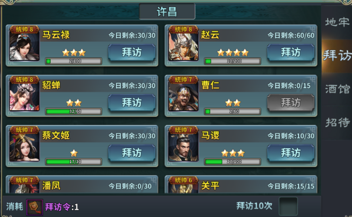拜访:获得统帅8和10的武将后,部分武将会显示在拜访系统里面,每日可通弄过消耗拜访令获取武将将魂,每日重置拜访次数。